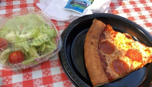 We ended up ordering a slice of pizza for our first meal and it came with a side salad with choice of Ranch or Caesar dressing. Had we paid out of pocket, the pizza and salad would have cost us $7.29.